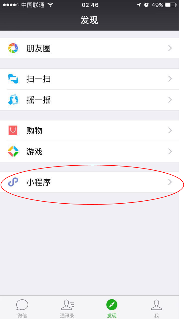 现在打开微信,点击底部的「发现」按钮,你会发现,页面中多了一栏图标为 S 型的「小程序了,点击即可进入小程序页面。