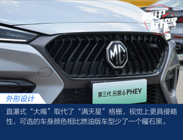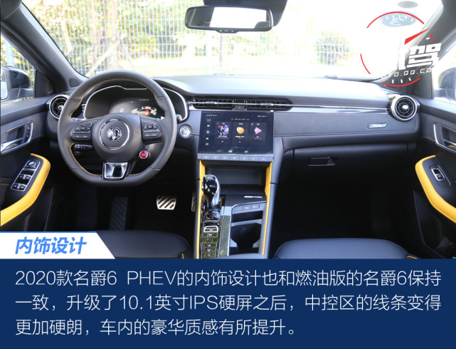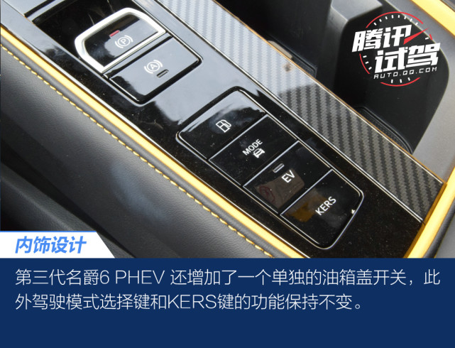 作为名爵6的插电混动版车型,名爵6 PHEV 的外观自然和燃油版车型无异,同时第三代名爵6 PHEV 也延续了老款车型的传统,并未在车身上增加代表新能源的装饰,除了充电口和尾标。但凭着第三代名爵6现有运动套件及燃情设计,挂上绿牌的PHEV版更符合运动性能身份。内饰方面保持中控设计的基本上,在缝线颜色、配置控制键细节进行了调整,去掉了原有声浪控制阀门,加入了油电模式控制,并搭载斑马智行3.0系统以及L2.5PLUS驾驶辅助系统。