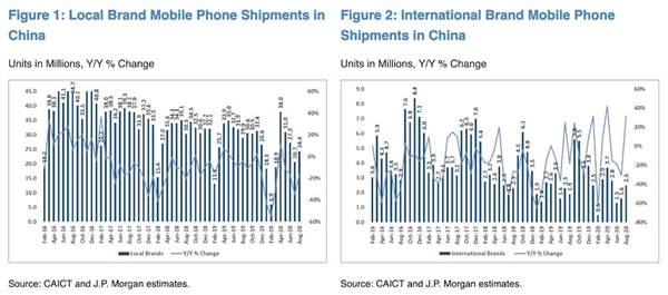 JP Morgan(摩根大通,小摩)基于中国信通院的数据,制作了对中国市场智能手机出货的研报。