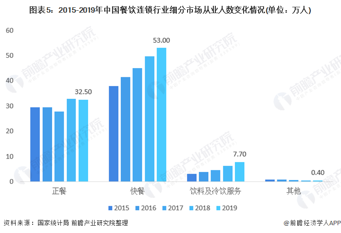 据前瞻产业研究院显示,,2015-2019年,快餐连锁企业从业人数稳居第一,且一直处于稳定增长态势,2019年,快餐连锁企业从业人数达53万人;正餐连锁企业从业人数波动变化。在结合门店数量情况看,2019年,快餐连锁企业平均单店从业人数达28人,正餐连锁企业为41人,可见,正餐连锁企业单家门店创造的就业岗位仍要高于快餐企业,在缓解就业压力方面具有重要作用。