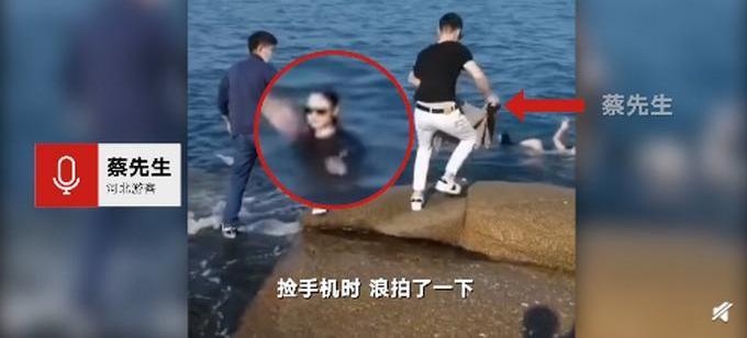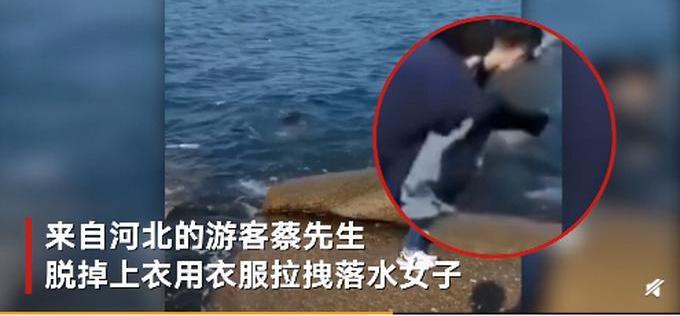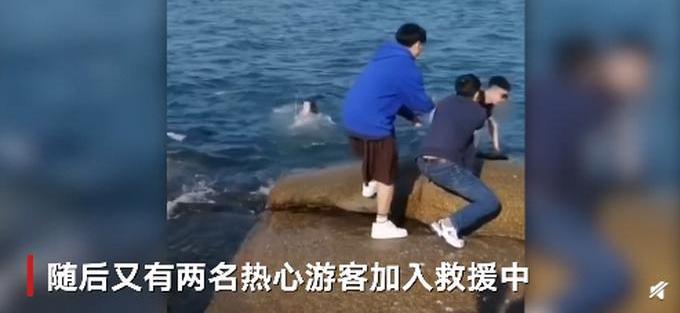 5月2日,山东青岛燕儿岛附近礁石上,两名女子捡手机落水,一名男子率先到达礁石上营救。现场画面显示,该男子没有营救工具,又有热心游客跑到礁石救人。来自河北的游客蔡先生脱掉上衣,用衣服拉拽落水女子。几分钟后,两名女子成功获救。