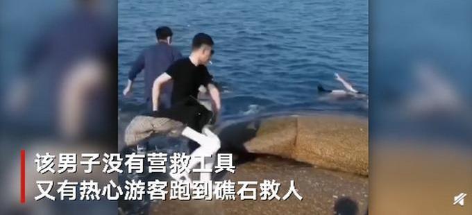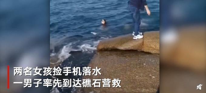 【摘要】 5月2日,山东青岛燕儿岛附近礁石上,两名女子捡手机落水,一名男子率先到达礁石上营救。现场画面显示,该男子没有营救工具,又有热心游客跑