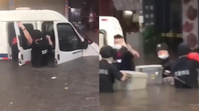 5月31日,广东东莞。广东东莞突降暴雨,街道积水严重,没过腰身。一辆运钞车被困水中,押运人员现场转移钞票,从运钞车上转移了多个保险箱。当地已发布暴雨红色预警,市民出行请注意安全。