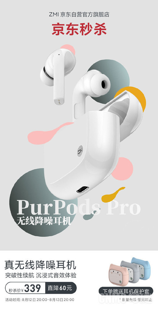 【摘要】 8月12日,紫米官方宣布,ZMI PurPods Pro真无线降噪耳机秒杀来了!今天12:00整到8月13日20:00,入手该耳机可直降60元,到手价仅需339元,