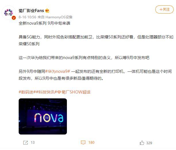 由于众所周知的原因,华为目前推出的大部分手机都在主推 4G 机型,而现在有爆料称,华为 nova9 系列支持 5G 网络。数码博主 @菊厂影业 Fans 透露,该机不但支持 5G,而且外观色彩更加时尚,但芯片不比荣耀 50 搭载的高通骁龙 778G SoC。