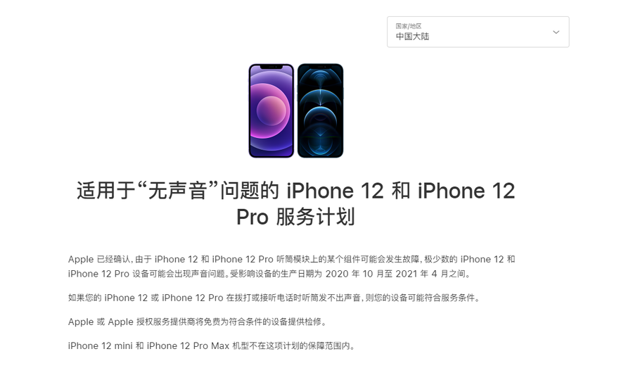 【摘要】 8月30日消息,苹果技术支持服务官网在近期出现了一则针对于iPhone12和iPhone12 Pro的服务计划。苹果官方称,此项计划适用于产生无声音问题