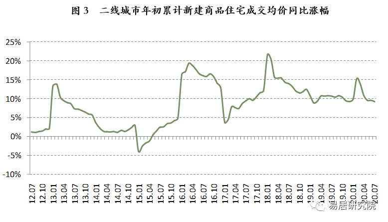 1-7月份,32个二线城市新建商品住宅成交均价为15431元/平方米,同比上涨9.3%。近5个月中,二线城市年初累计房价同比涨幅曲线总体下行,和全国趋势非常类似。