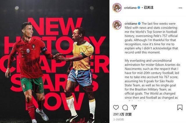 意甲对阵卡利亚里,C罗完成帽子戏法,个人正式比赛进球达到770粒,毫无疑问地超越了贝利。在贝利通过社交媒体发出祝贺后,C罗也在Ins上发布了自己的宣言。