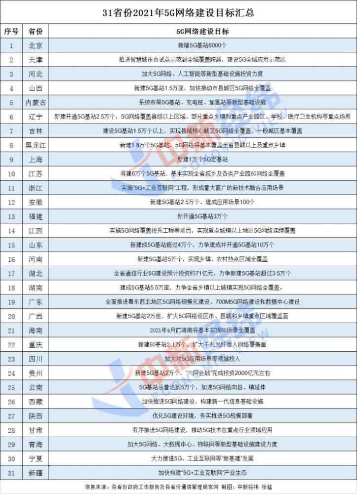 中新经纬记者梳理发现,31省份均已发布2021年5G网络建设目标,其中多省份明确基站建设数量,从几千个至几万个不等。