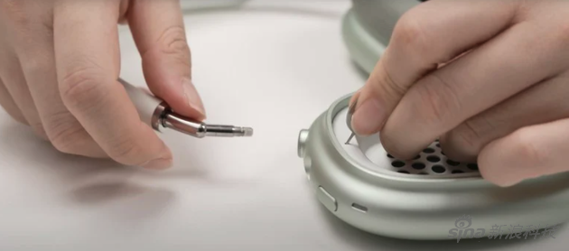 如果取下耳机两侧的磁性耳罩,会看到有个小孔,用SIM卡针一捅就可以看到背后的玄机,整个扬声器部分都是可以拿下来的,而且还可以装回去。