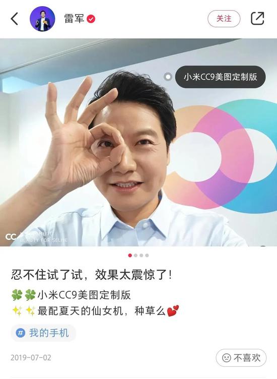 2019年7月,小米推出了小米CC9,这是一款面向女性群体主打拍照的高颜值手机。雷军顺势入驻小红书,成为小红书认证的第一位企业家。
