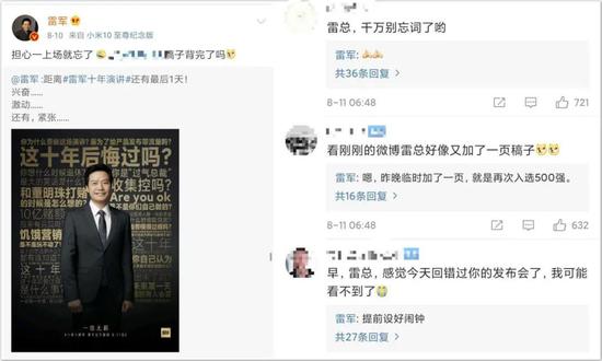 不仅如此,雷军在经常在微博回复网友的评论。在昨天发布会开始前,网友都在催雷总背稿子... ...