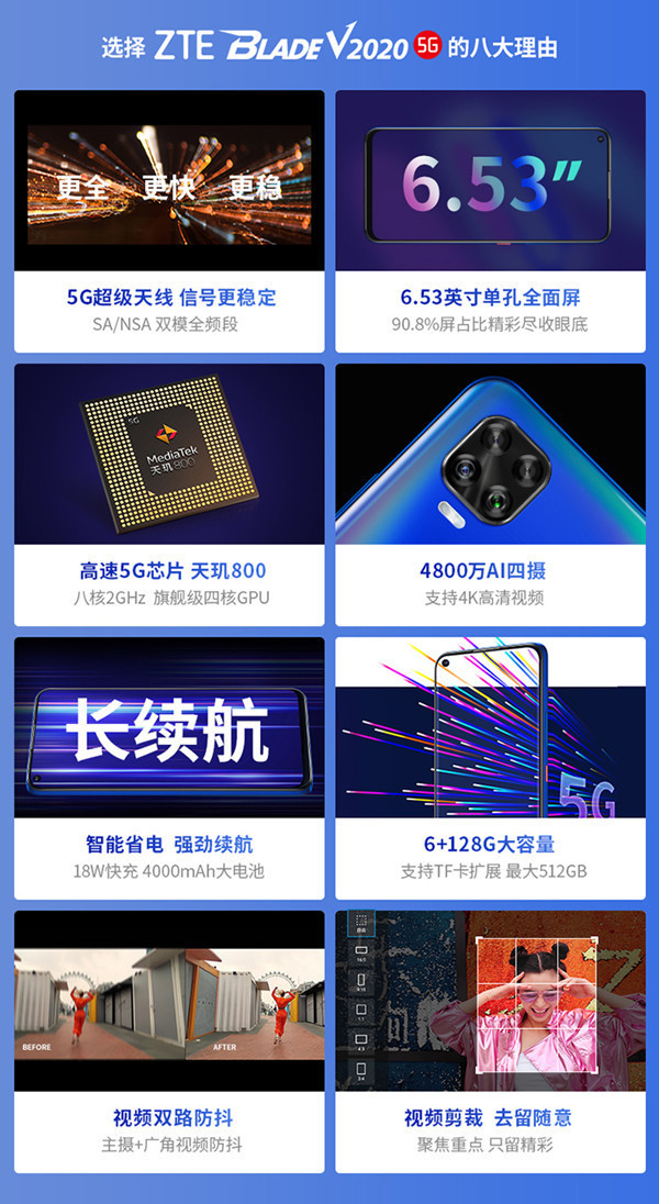 配置上,该机搭载了天玑800处理器,辅以中兴5G超级天线方案,支持超全5G频段,360度环绕集成天线设计加持,能够智能捕捉最佳天线,速率更快、信号更稳;配备了LPDDR4X内存和UFS 2.1高性能闪存,最高传输宽带为4.2GB/s,顺序读取速度最高为950MB/s;配备了4000mAh大电池,续航持久,支持18W快速充电。