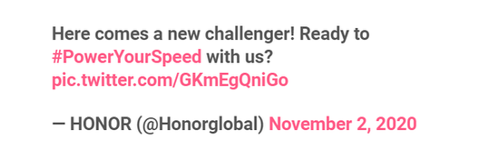 11月2日,荣耀手机海外官方账号发文称“新的手机即将到来,请准备好!”,并公布了一张宣传海报,上面展示了一款手机的上半部分外观。