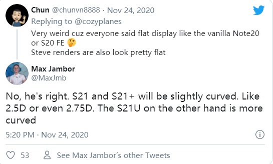 根据 Max 说法,三星 S21 和 S21+ 的显示屏会有轻微的弧度,而 S21 Ultra 的显示屏则会有更大的弧度。从我们看到的三星 S21 系列泄露渲染图来看,S21 和 S21 + 显示屏似乎是平面的,但现在 Max 却声称不是。