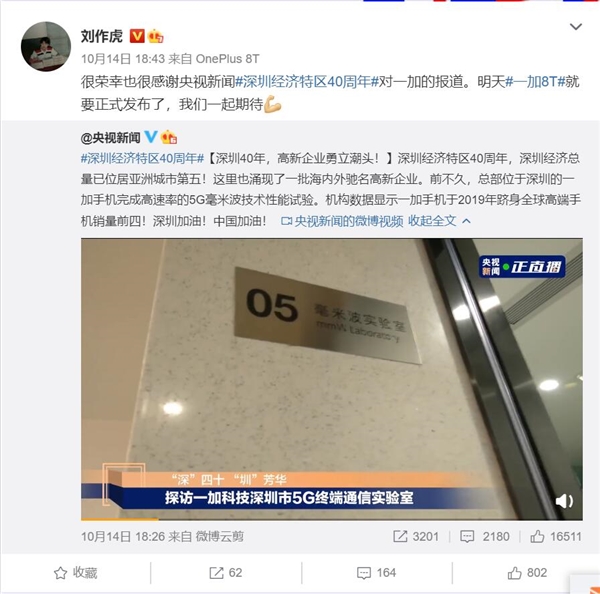 10月14日消息,一加登上央视新闻。