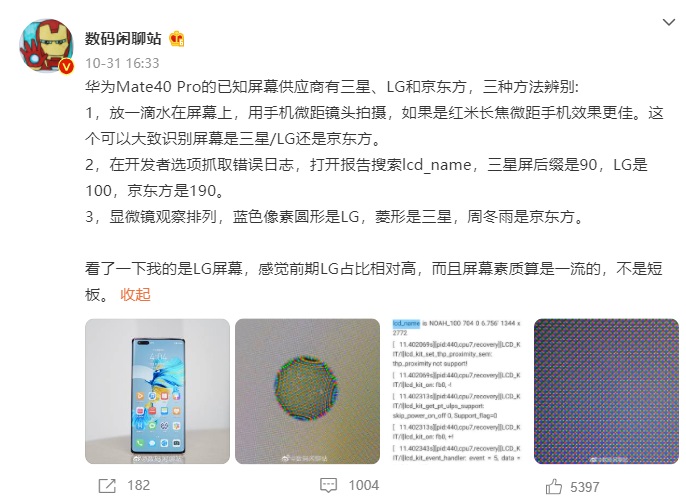 据数码博主 @数码闲聊站 爆料称,华为 Mate40 Pro 的已知屏幕供应商有三星、LG 和京东方。