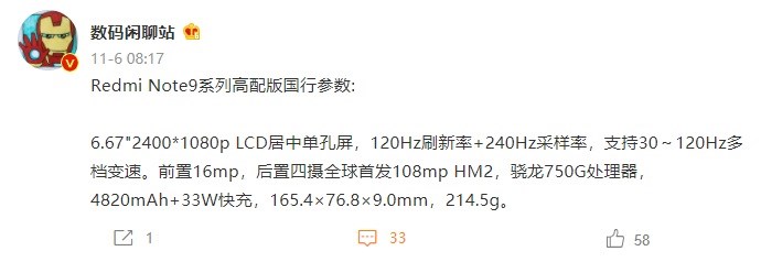 作为对比,Redmi Note 9 高配版采用 6.67 英寸居中单孔屏,2400×1080 分辨率、120Hz 刷新率与 240Hz 触控采样率,支持 30-120Hz 多档变速。搭载骁龙 750G 处理器,内置 4820mAh 电池,支持 33W 快充,前置 16MP 摄像头,后置四摄将全球首发 108MP HM2。机身尺寸为 165.4×76.8×9.0mm,重 214.5g。