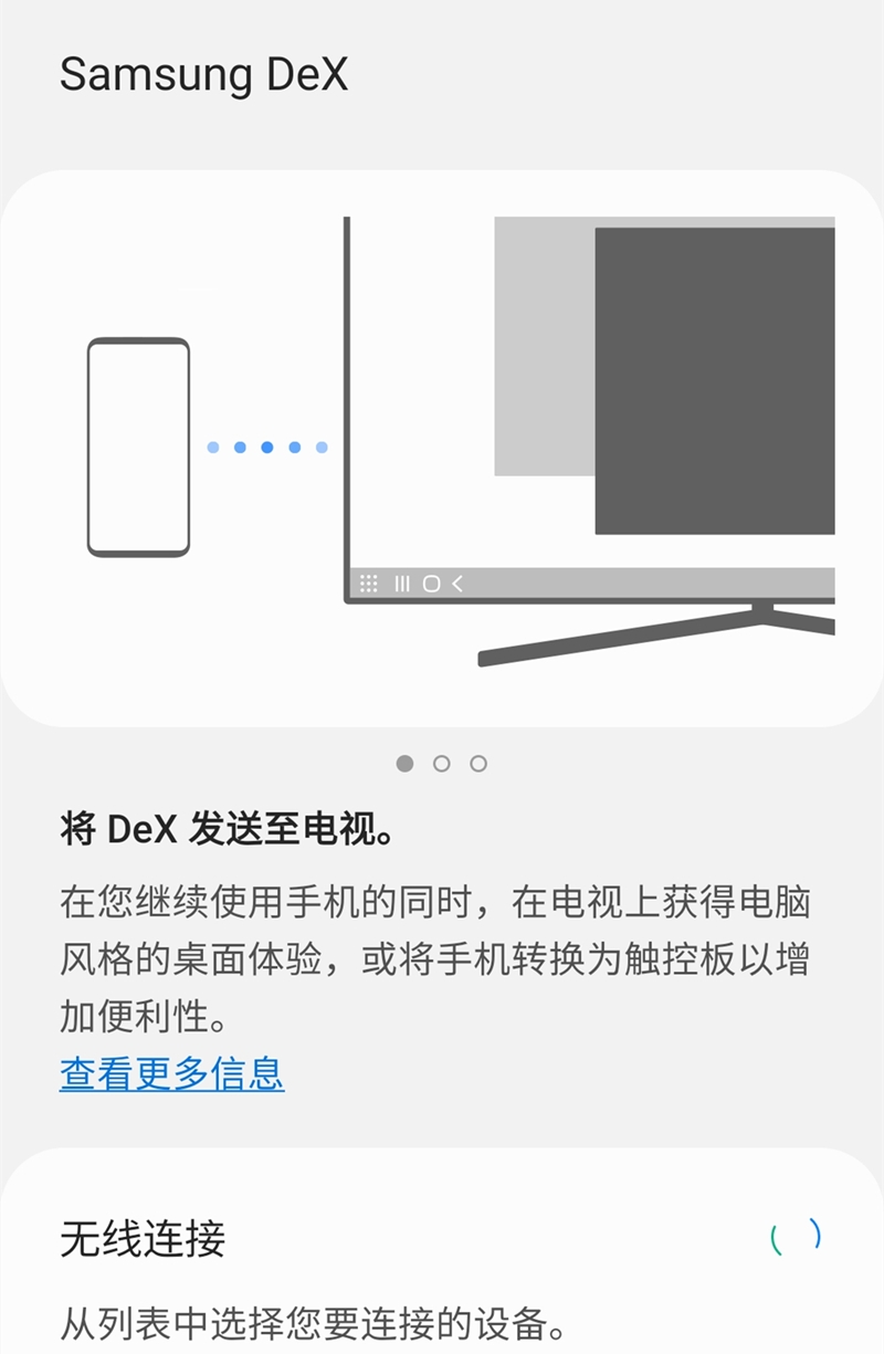 在One UI 2.5中,DeX 已经能够通过无线网络将 DeX 影像投射到显示器或电视上,使用该功能的时候,手机还能够作为触摸板(三指单击返回、四指单击打开应用抽屉)和键盘使用。