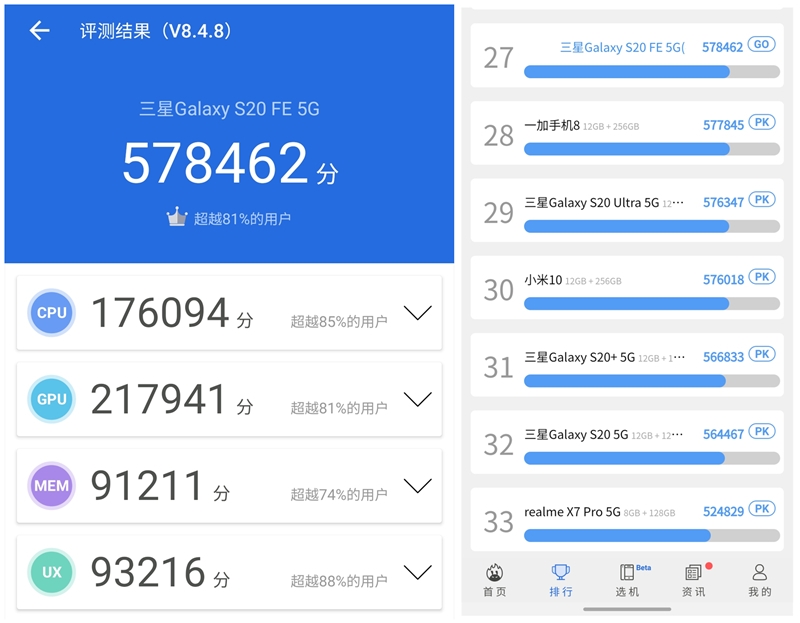 在安兔兔的评分体系当中,三星Galaxy S20 FE 5G的性能水准与同时期的其它Galaxy S20系列旗舰相当。