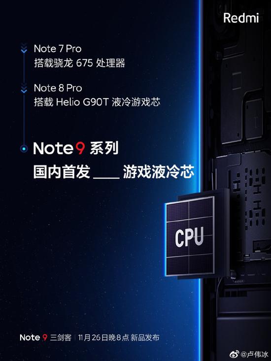 今日上午,小米集团副总裁,中国区总裁,红米 Redmi 品牌总经理卢伟冰还提到,Note 7 Pro 搭载新一代骁龙 675 芯片,Note 8 Pro 搭载 G90T 液冷游戏芯,这一次,Note 9 系列国内首发一枚液冷游戏芯。