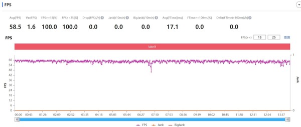 对于《王者荣耀》来说,如果手机性能不足的话,游戏过程中会出现卡顿、掉帧等问题。尤其是在5V5团战时刻,各种技能特效的叠加对手机性能提出了更高的要求。通过实测发现,真我V3的平均帧率可以保持在58.5fps,帧率表现基本稳定,在14分钟的全局游戏中,团战时刻偶尔会有帧率波动,但不会卡顿,整体游戏体验较为出色。