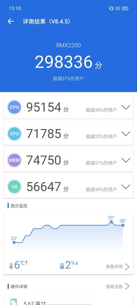 在测试完真我V3的5G能力之外,我们也试了一下它的性能。首先测试的是不少人比较认同的安兔兔跑分,从测试结果来看,真我V3的安兔兔跑分为298336分,超越31%的用户,在百元级价位段是比较突出的。具体到各个子项跑分,真我V3的CPU得分为95154分,GPU得分为71785分,UX得分为56647分,MEM得分为74750分。真我V3采用的是双通道LPDDR4X RAM+双通道UFS2.1 ROM的配置,拥有6GB+64GB,6GB+128GB和8GB+128GB三种超大内存组合。