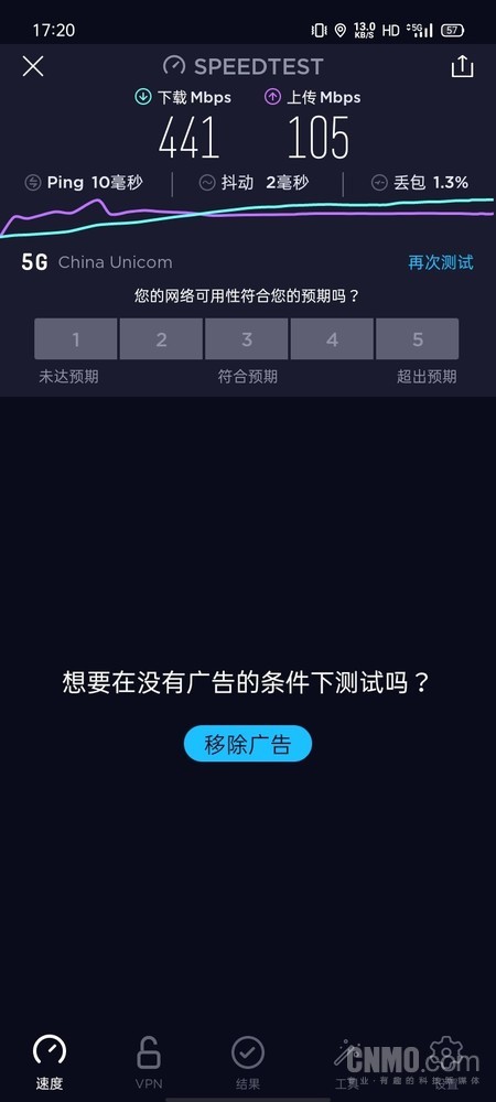 为了让大家更加直观的感受5G的速度,我们也用Speedtest为大家测了一个速,测试套餐选择的是中国联通限速500Mbps 5G套餐。通过实际测试,真我V3的下行速率可以达到441Mbps,上行速率达到105Mbps,Ping值为10毫秒,抖动2毫秒,整体表现出色,可以为用户带来极致的网络体验。