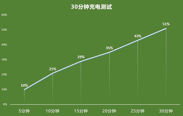 OPPO K7x同时也配备了30W闪充功能,在68分钟内就可将5000mAh大电池的手机充电至100%。在实际测试中使用原装65W闪充充电器的情况下,可以在30分钟的时间内将OPPO K7x 5000mAh的电池电量从电池耗尽充至51%。由此可见,OPPO K7x不但充电很快而且耗电很慢,可以说续航体验相当优秀。