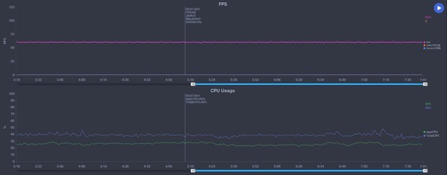 在游戏实测中,使用OPPO K7x试玩了国民级手游《王者荣耀》。在测试时,我们将游戏画质设置为最高并开启高帧率模式。在此设置下通过PerfDog记录的游戏画面帧率数据显示,OPPO K7x可以以60帧的帧率水平稳定畅玩《王者荣耀》,其帧率曲线较为平稳。