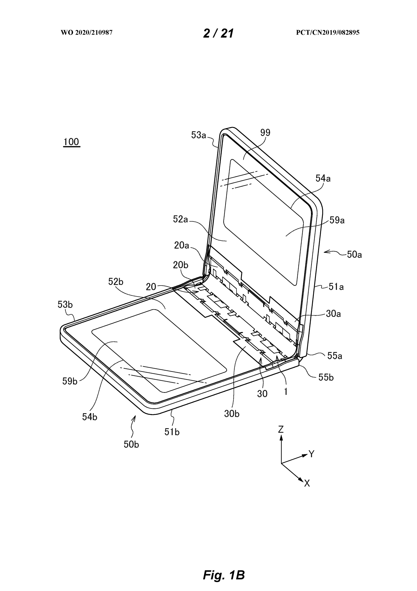 该专利描述了一种铰链结构,这个铰链具有两部分铰链单元组成,所描述的智能手机屏幕也分为两个部分,两段铰链可进行旋转和滑动,并可以通过简单地连接以进行支撑。