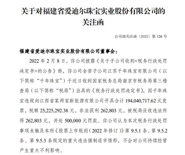 具体情况为,千年珠宝违反《中华人民共和国发票管理办法》相关规定向江西省某两家新能源有限公司开具合计1.94亿元发票,税额2522.53万元,非法获利26.28万元,被国家税务总局南京市税务局第三稽查局没收其上述违法所得26.28万元,并处人民币50万元罚款。爱迪尔称,本次税务行政处罚事项未触及《深圳证券交易所股票上市规则(2022年修订)》规定的重大违法强制退市情形,不会对公司持续经营产生重大不利影响。