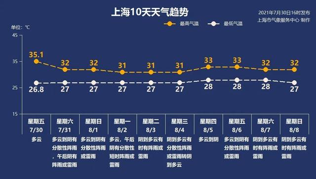 上海天气:27-32℃,多云到阴有分散性短时阵雨,午后转阴有阵雨或雷雨