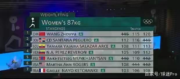 随后桑塔纳第二把抓举成功举起116公斤,但汪周雨第三把的抓举重量设在了120公斤,桑塔纳不得不连续试举,结果她第三把119公斤没有起来,抓举成绩定格在116公斤。