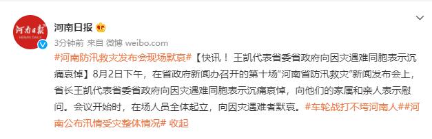 据河南日报消息,8月2日下午,在河南省政府新闻办召开的第十场“河南省防汛救灾”新闻发布会上,省长王凯代表省委省政府向因灾遇难同胞表示沉痛哀悼,向他们的家属和亲人表示慰问。会议开始时,在场人员全体起立,向因灾遇难者默哀。