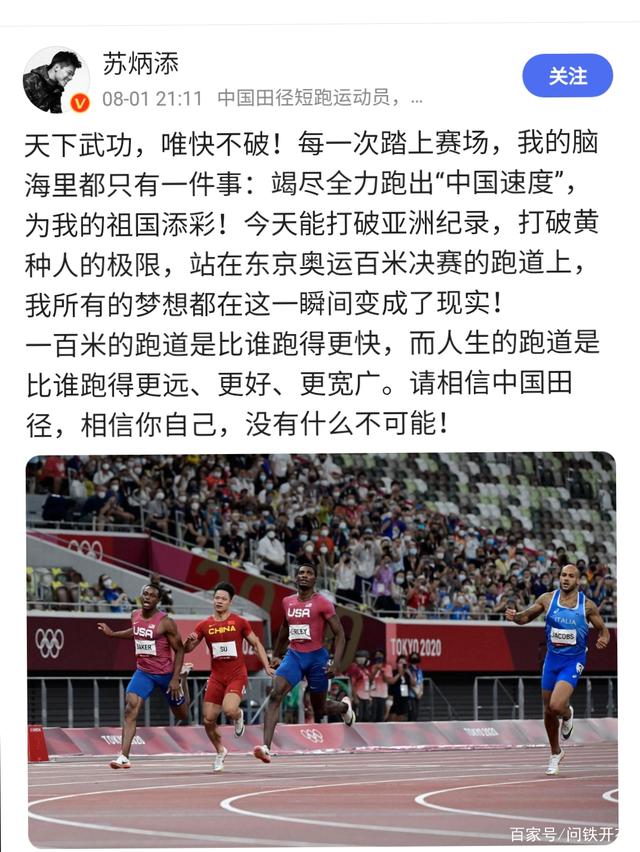 苏炳添发文说:天下武功,唯快不破!每一次踏上赛场,我的脑海里都只有一件事:竭尽全力跑出“中国速度”,为我的祖国添彩!今天能打破亚洲纪录,打破黄种人的极限,站在东京奥运百米决赛的跑道上,我所有的梦想都在这一瞬间变成了现实!一百米的跑道是比谁跑的更快,而人生的跑道是比谁跑的更远,更好、更宽广。请相信中国田径,相信你自己,没有什么不可能!