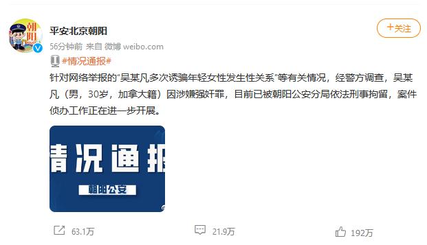北京市公安局朝阳分局7月31日晚10点发布警情通报,吴某凡(男,30岁,加拿大籍)因涉嫌强奸罪,目前已被依法刑事拘留。结合该案的社会影响力,朝阳警方既然有胆量公开发布警情,想必对案件证据材料非常有信心。