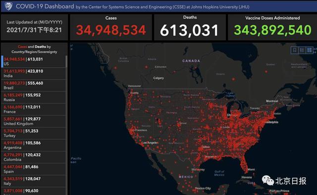 据约翰·霍普金斯大学数据,截至7月31日20时21分,美国累计确诊新冠肺炎超3494万例,死亡超61万人。