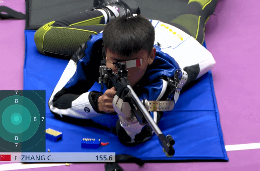 接下来是卧姿的第一轮比赛,张常鸿和第二名打出了相同的环数,继续以0.1环的微弱优势领先,第二轮比赛,白俄罗斯选手出现巨大失误,直接下滑到了第三,而张常鸿则是继续领先。第三轮比赛,张常鸿仍是第一名,但是领先优势仅有0.4环。卧姿第四轮,资格赛第一名的卡门斯基追了上来,但张常鸿依旧稳定。