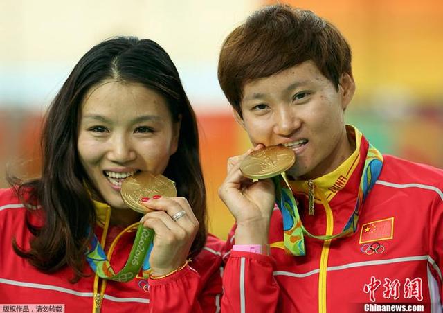 资料图:里约奥运会场地自行车女子团体竞速赛,由宫金杰和钟天使组成的中国队以32秒107夺取金牌。
