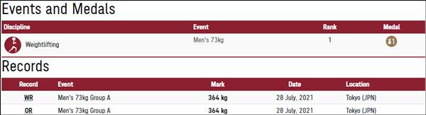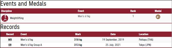 男举61公斤级冠军李发彬:抓举141公斤、挺举172公斤、总成绩313公斤,挺举、总成绩打破奥运纪录,该级别总成绩世界纪录318公斤由李发彬在2019年创造。