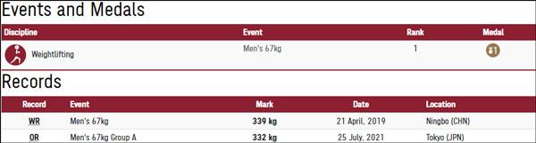 男举67公斤级冠军谌利军:抓举145公斤、挺举187公斤、总成绩332公斤,挺举、总成绩打破奥运纪录,该级别总成绩世界纪录339公斤由谌利军在2019年创造。