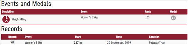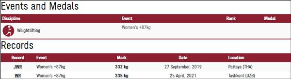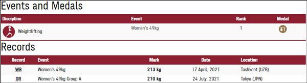 女举49公斤级冠军侯志慧:抓举94公斤、挺举116公斤、总成绩210公斤,抓举、总成绩打破奥运纪录,该级别总成绩世界纪录213公斤由侯志慧在2021年4月创造。