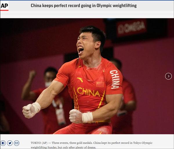 中国军团的连胜战绩也引起了外媒的关注,在谌利军惊天逆转为中国举重队拿下第三金时,美联社发文赞叹中国队在奥运会举重项目上“保持完美纪录”。