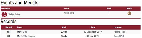 男举81公斤级冠军吕小军:抓举170公斤、挺举204公斤、总成绩374公斤,抓举、挺举、总成绩均打破奥运纪录,该级别总成绩世界纪录378公斤由吕小军在2019年创造。