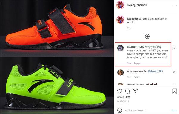 还有英国网友,因为与吕小军合作的运动鞋发货区不包括英国而“吃醋”。