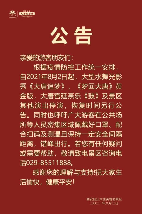 今天(8月2日),大唐芙蓉园发布公告:根据疫情防控工作统一安排,自2021年8月2日起各项演出停演。
