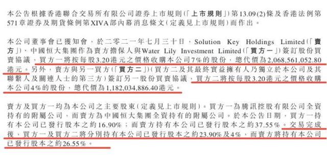 据恒腾网络公告,卖方(中国恒大集团全资持有的附属公司)与买方一(腾讯控股有限公司全资持有的附属公司)签订股份买卖协议,买方一将按每股3.20港元的价格收购公司7%的股份,作价20.69亿港元。另外,卖方还向买方二(独立第三方)出售了4%的股份,作价11.82亿港元。
