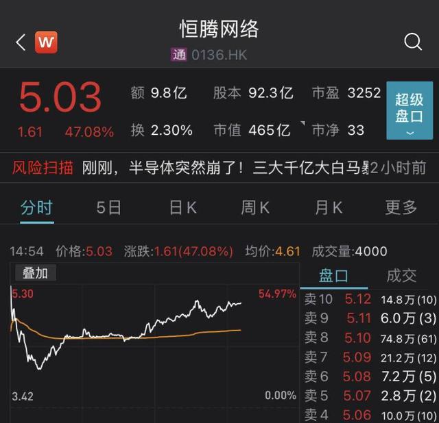 8月2日上午9时,恒腾网络恢复交易,开盘即涨超30%。截至记者发稿,恒腾网络高涨近47%,报5.03港元/股,总市值465亿港元。