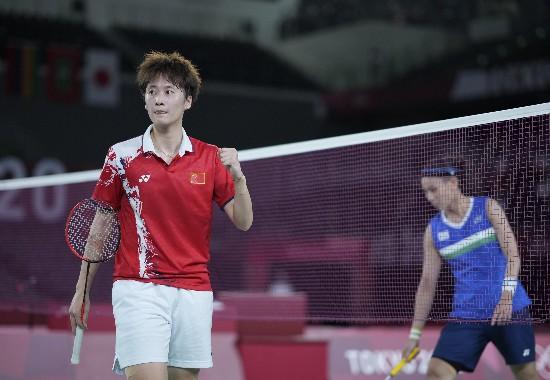 8月1日,陈雨菲(左)在比赛中庆祝得分。